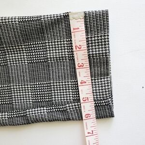 Blk/white small plaid pattern with a gold metalic thread in material. Faux front pockets -2 open back pockets. 6" leg opening. 25" inseam waist 17"flat