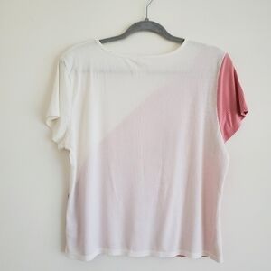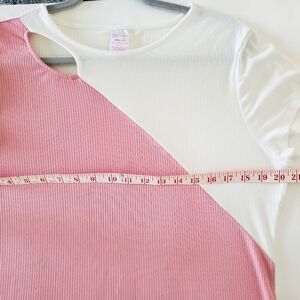 No BOUNDRIES Great Colour Block Stretchy Rayon Spandex Blend. Shorter sleeves, round scoop neckline with an attractive cut out on Rt shoulder area.