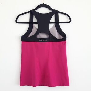 2for35 Under Armour Racer Back Athletic top in Dark Pink/ BLK. ( my camera seems to make it look brighter pink but it is dark fusia pink) This is in New condition. No wear, no stains/ snags . There are no size tags on top- by measurements I am suggesting Small. Please see photos for Flat Measurements.