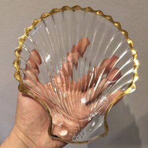 🌷2/35🌷Vntg Seashell Crystal Glass Trinket Dish 18k Gold Rim with Fruits Grapes