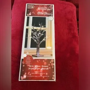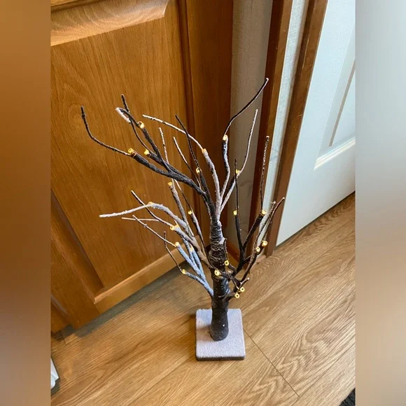 LED are white and tree looks like it is covered in snow. In off switch on back of stand flexible branches