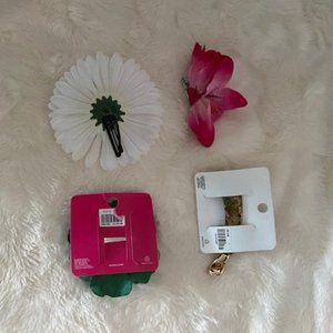 Includes four hair accessories all new. The fuschia flower hair clip is new without tags from Ardene's. Paisley brown-coloured hair clip is new with tags from Ardene's. green flowered hair clip is new with tags from Ardene's. Daisy flower clip is new without tag. This post is for the items in the listing. Mix and match for bundle price. Colour depends on device/screen settings and lighting in pictures. All items are from my smoke free home.