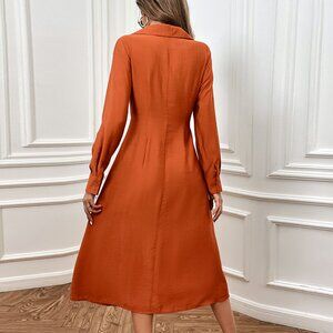 2/$40 Elegant Ruched Midi Dress Orange Brown Long Sleeve Collar Thigh Slit
