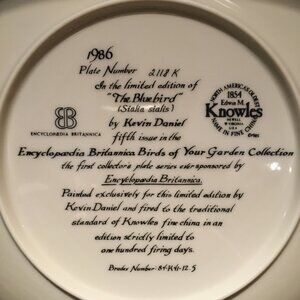 Very good preowned vintage condition, limited edition decorative plate titled 'The Blue Bird' featuring an illustration of a pair of blue birds flapping among flowers by Kevin Daniel, in bright greens, reds, blues and earth tones. Produced for Knowles, Encyclopedia Britannica's 'Birds of your Garden Collection' series in 1986, though stamp has a '1985' printed next to it to indicate it may have been produced earlier.
