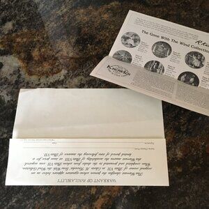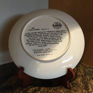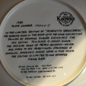 Very good vintage condition, limited edition decorative plate titled 'Scarlett's Green Dress' featuring an illustration by Raymond Kursar of Rhett admiring Scarlett's very resourceful dress. Plate is in great shape. Like the others in this series, there is no gold on the rim. I may have the box and certificates which I will upload shortly if I do have them. Produced for Edwin Knowles. The seventh issued plate in this particular series. I have quite a few 'Gone with the Wind' plates that I will post with appropriate boxes, certificates and receipts. If there are any in particular you're interested in, please feel free to contact me and ask. Otherwise, they will be uploaded in the next few months or so. This plate is dated 1984.