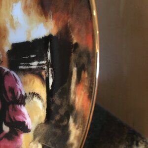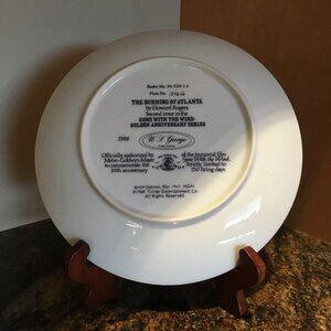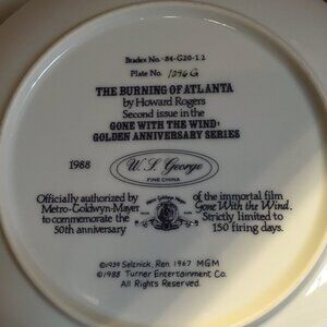 Very good vintage condition, limited edition decorative plate titled 'The Burning of Atlanta' featuring an illustration by Howard Rogers featuring Scarlett and Rhett against a backdrop of fiery hellscape. Plate is in great shape. Gold on the rim. I may have the box and certificates which I will upload shortly if I do have them. Produced for W. S. George's Gone With the Wind Golden Anniversary Series. The second issued plate in this particular series. I have quite a few 'Gone with the Wind' plates that I will post with appropriate boxes, certificates and receipts. If there are any in particular you're interested in, please feel free to contact me and ask. Otherwise, they will be uploaded in the next few months or so. This plate is dated 1988.