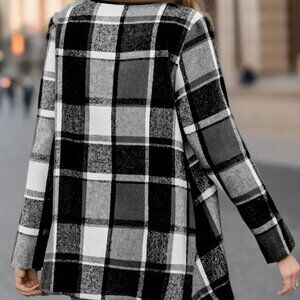 TAGS: Plaid cardigan, Open front jacket, Waterfall cardigan, Black and white plaid coat, Casual layering jacket, Long sleeve cardigan, Lightweight jacket, Chic plaid cardigan, Workwear cardigan, Cozy fall cardigan, Street style jacket, Draped cardigan, Modern plaid coat, Trendy women’s jacket, Everyday cardigan