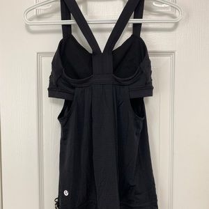 Lululemon tank top in Black/heathered black stripe. Cute opening at sides, adjustable cord at hemline. Great condition, size 4.