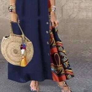 Embrace effortless elegance with this navy blue maxi dress featuring a distinctive side button detail and a vibrant, patterned panel for a touch of bohemian flair. The relaxed fit and three-quarter sleeves make it a perfect choice for both casual outings and special occasions. Pair it with your favorite accessories for a personalized style statement.