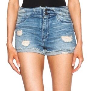 These denim shorts feature button front closures, pleat detail along top, distressed fabric throughout, and raw cut frayed and rolled and stitched in hem.