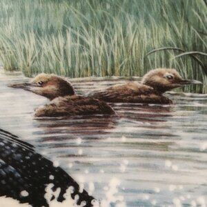 Very good preowned vintage condition, limited edition decorative plate titled 'Time To Fly' featuring illustration of a mating pair of loons and their chicks taking their first piloting lessons by Don Li-Leger. Painted in a rich array of greens, blues and soft browns. Produced for Dominion China Ltd, The Loon: Voice of the North series in 1991 for The North American Loon Fund. Replete, like most of these plates, with a real gold rim. This one has a unique pattern. Plate 4 of a series of 4.
