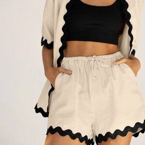 2/$40 Women’s Peach Beige Button Down Shirt & Shorts Set with Black Trim Outfit