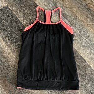 Stylish black tank top with pink accents. Features a racerback design.