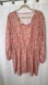 Chic floral dress with long sleeves. Features a coral and white pattern. Perfect for any occasion. Pretty coral color with cream, flowers, elastic cuff, and waist.