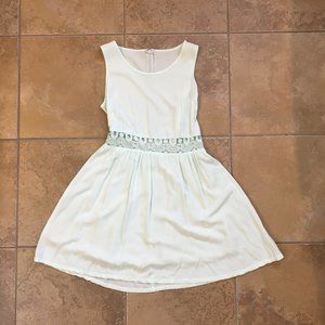 Mint Green Mini Dress. See-through lace at the waistline. Round-neck. Skirt is lined. Safety closure on zipper.