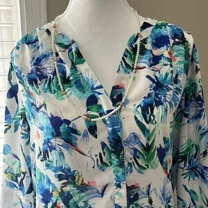 ❤️2/$50❤️[M]NYDJ Blue White Floral V Neck Pull Over L/S 3/4 Sleeves Blouse