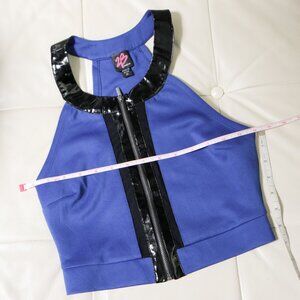 Sexy early 2000s cobalt blue body hugging crop top with black faux patent leather and sheer panels down the middle. Silver zipper hardware. Polyester spandex blend, made in China