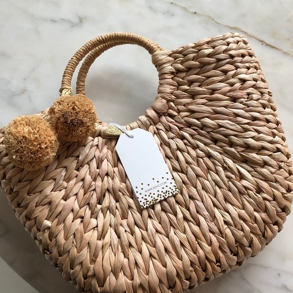 2Chic Corn Husk Basket Bag with Pom Poms, NWT