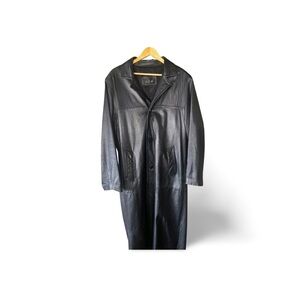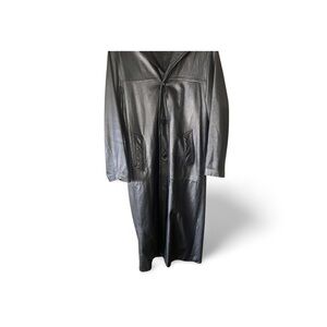 Full-length genuine leather trench with matte finish and sharp shoulders.