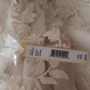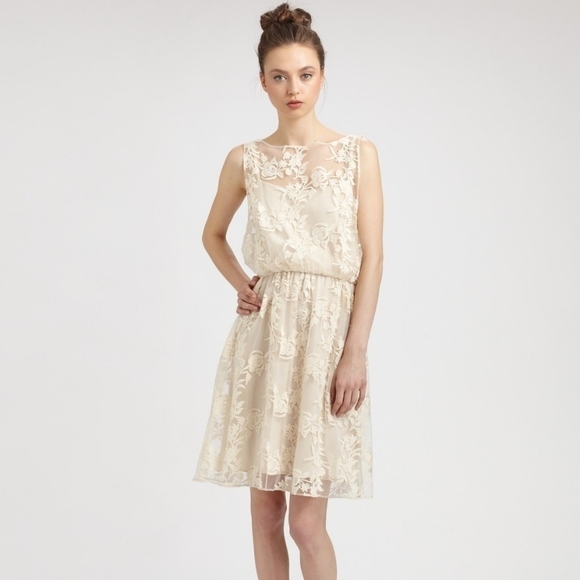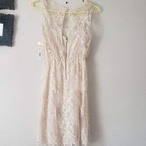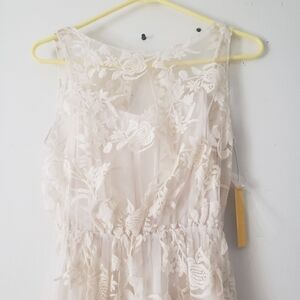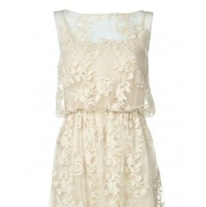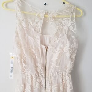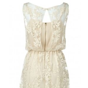 A top layer of floral lace turns this simple cocktail frock into something sweet; which you can slip comfortably into after your wedding ceremony and dance the night away. Love its French-girl feel and chic peek-a-boo effect on skin. Features a sheer lace overlay, slip lining, keyhole opening at back, faux pearl button closure, elastic waistband, exposed zip closure, 50% cotton 50% nylon
