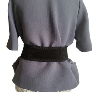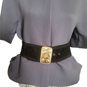 Vintage Chanel black suede leather belt with gold plate buckle and crochet trimmings. Great preowned condition with minimal signs of wear considering its age. Slight fading on gold plate buckle barely noticable.