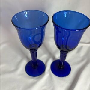 2-cobalt blue wine glasses, holds 7 oz. Measures 7.75” high x 3” at the rim.