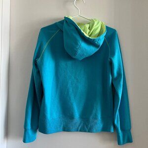 Blue zip-up hoodie with neon geen yellow hood, drawstring, and zipper