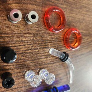 2g (two gauge) lot - including metal tunnels, plastic hoops, 3 stretchers, plastic plugs and plastic star tunnels. Extra o-rings.