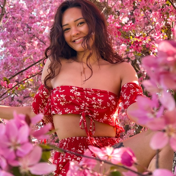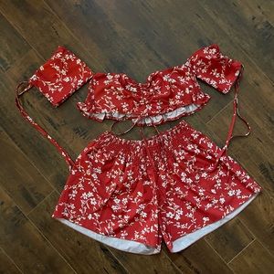 Ditsy floral 2pc; off shoulder crop top and skort