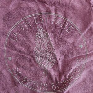 This 2-piece outfit is a charming and stylish combination! The pink top from Cesar & Rosalie "La vie est fait de petits bonheurs" print brings a light, positive energy, and the lace detail adds a delicatematched paired with the soft dark blue Lazypantz leggings, it offers both comfort and a subtle contrast.
