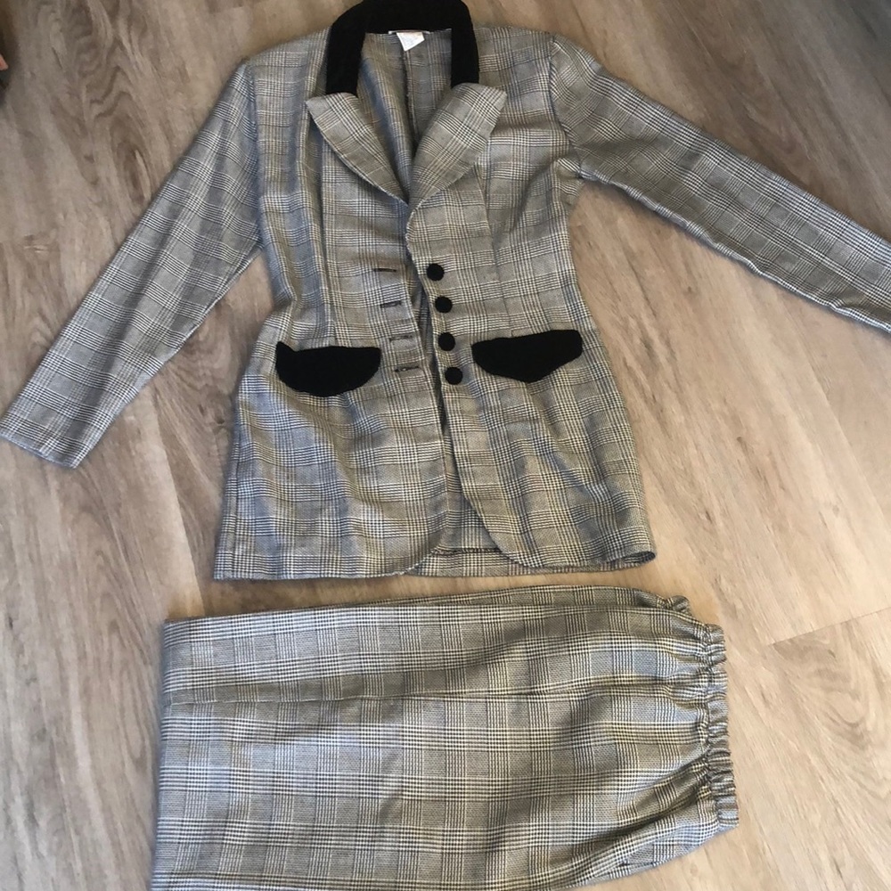XS/S plaid jacket & pants, black & grey pattern, light fabric. Velvet accents to collar & pockets & on the 4-buttons
