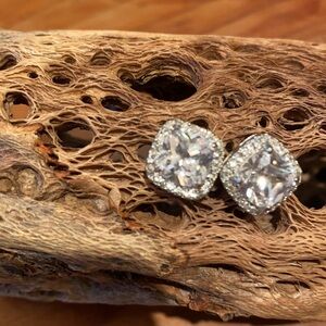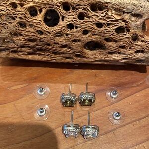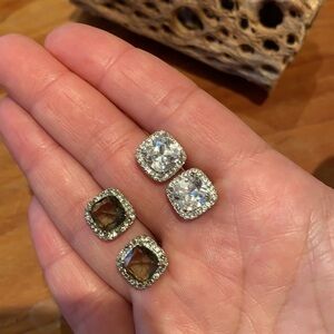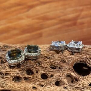 Bundle of 2 pairs large stud earrings. These are “costume jewelry” and not any sort of precious metal or stone. I bought these to wear to a wedding in September. I wore the green/gray center ones and brought the clear ones as backup. Nothing wrecks photos more than ending up with only one earring and looking like the pirate 😉. And when you’re hugging everyone it’s so easy to lose one! These are large and have some decent weight to them. They have been cleaned/sanitized and are ready for someone else to wear over the holidays!