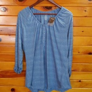 Very pretty top by George is light blue striped and features cute buttoned cuffs, hi-lo hem and buttoned ruffle on front. Polyester/cotton top measures 27" shoulder to hem front 30" shoulder to hem back and 23" armpit to armpit.