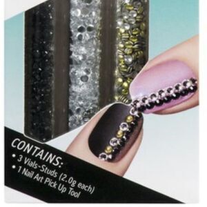 The ultimate arsenal for 3-D nails. Layer on must-have nail toppers for stunning depth and texture. Each set contains three embellishment colors to create rich, brilliant looks. Create works of art on each nail. Contains one nail art pick up tool. Silver, gold and black studs!