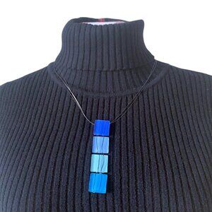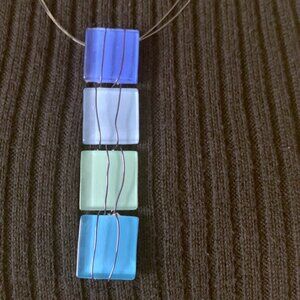 Style: Short necklace - black & silver tone flexible wires - little ceramic square in a line attached with bendable blue tone wire -