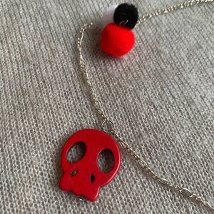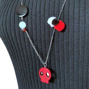 Style: Skull long necklace - ribbon in the back (neck) - beads - fabric pompom - regular pompom - chains - Ribbon clip clamps