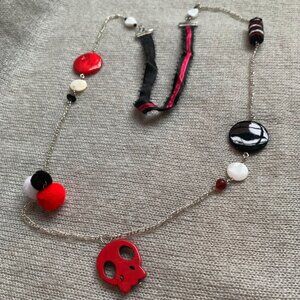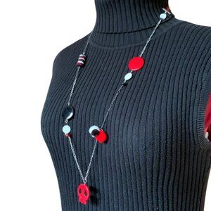 2x18$ ๐ฆ ๐ CREATION - Skull long necklace - ruban beads fabric - Red b&W