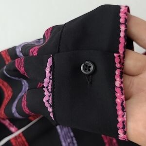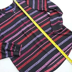 Excellent pre-owned condition, APT. 9 long, roll-up sleeves blouse top with pink, red and purple stripes on black, in a lightweight, flowy and semi-sheer fabric and zip up collar, size Medium.