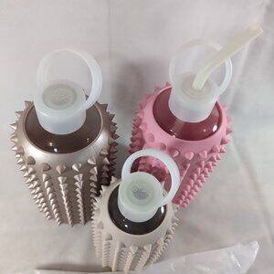 Set of 3 BKR glass bottles with silicone sleeves! Includes 3 lids, 2 large, including one with the straw attachment, one with the regular lid, and a small lid for the 500ml. 2 Big 1L bottles, one 500 ml. Comes with 3 straws. All in pre-owned condition, may have some minimal wear, please see pictures.