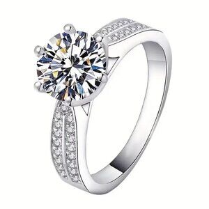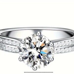 Surrounding the center diamond, there are two parallel channels running along the sides of the band. These channels hold smaller, perfectly matched diamonds that are carefully set into the band.