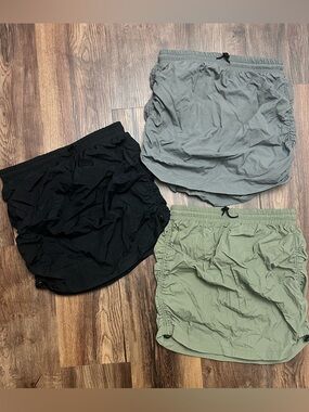 3 Drawstring mini skirts in green, grey and black with drawstring at the waist and drawstring rushing detail along each side of the hips. Skirts are identical styles in 3 different colours. Perfect for casual outings.
