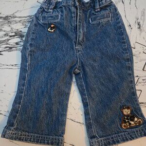 **Vintage baby denim, 90s toddler fashion, embroidered teddy bear jeans, flared baby jeans, retro baby clothes, Y2K toddler outfit, baby bell-bottom jeans, rare vintage baby jeans, durable baby denim, nostalgic baby fashion, classic baby jeans, teddy bear embroidered pants, toddler adventure outfit, early 2000s baby fashion, vintage kidswear, trendy toddler