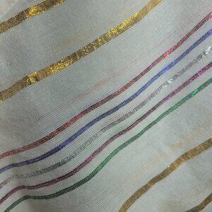 An airy and feminine boho blouse with multicolour rainbow metallic striping for a pop of fun that will brighten up any outfit. Pair with high rise jeans for a look that says layed-back summer cool. 100% Indian cotton (super thin and fine). Features a lovely gold crochet “ladder” detail in the middle of the front and back. Elasticized shoulders to be worn off the shoulder or as a regular V-neck.