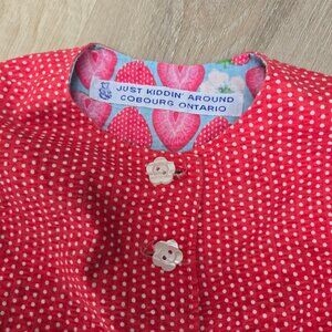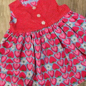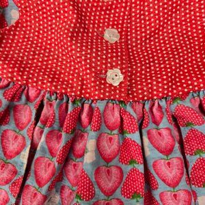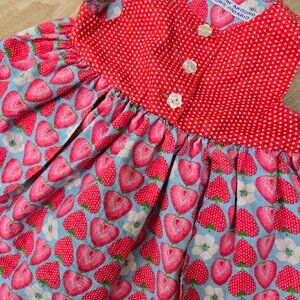 Charming vintage strawberry-themed petal dress in excellent used condition (EUC). Made of soft 100% cotton. Size 12 months. Features petal-style skirt layers, strawberry appliqués, and button-back closure.