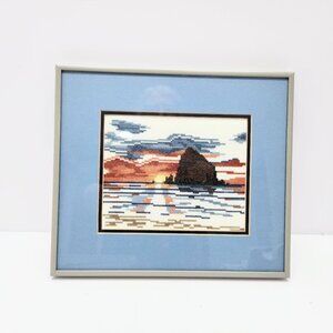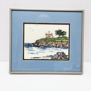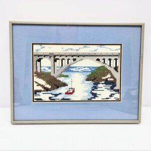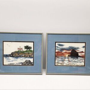 3 Framed Prints Blue Needlepoint Water pictures, Boating Bridge Lighthouse