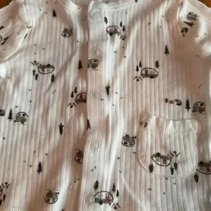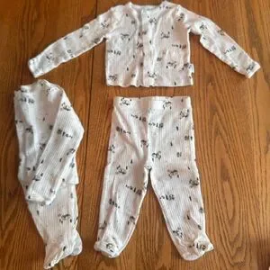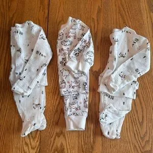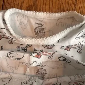 3 matching sets. The cat one is George brand. Pants were worn once and top never worn. The other two are two of the same and are Gerber brand. Both never worn. Cat friendly, smoke free home. Washed in gentle, fragrance free detergent only. No scents.