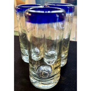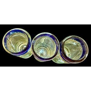 3 Mexican Hand Blown Shot Glass Blue Rim 4”