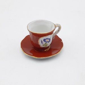 A set of 3 miniature tea cups and saucers, matching and red and 1 white. The 2 red cups were made by T. Limonges while the 3rd is un-marked (I didn't misspell Limoges, that is the actual name). The 2 red have blue flowers (1 saucer has a red flower) while the white cup has red and orange patterns.