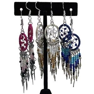 3 PAIRS of Dream Catcher Earrings Dangle Drop Refurbished Navy Pink Ivory Beaded