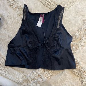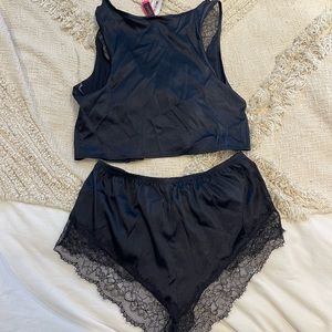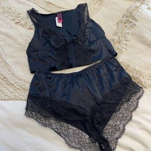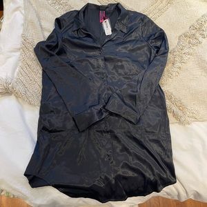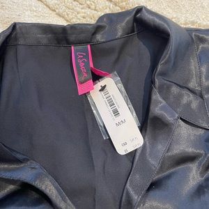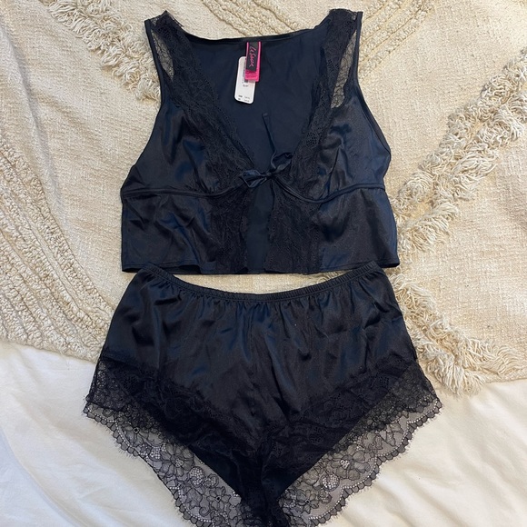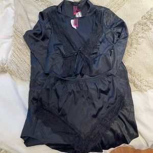 New with tags 3 piece satin lingerie/sleepwear set. Tie-front cami top size S, high cut shorts size S and long button up over shirt/dress size M. Classic and cute! It was a gift but doesn’t fit.